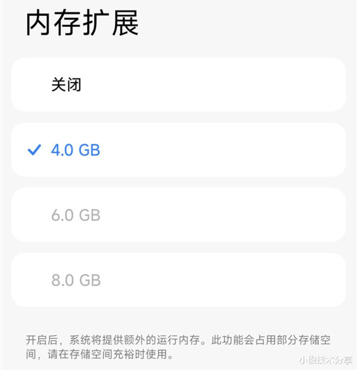 我们点进去看一下,看到没有,这里有4GB、6GB以及8GB,那么这是什么意思呢?意思就是说我的手机最大支持8GB内存扩展,我现在选择4GB,选择完之后,一定要重启才能生效啊,重启之后,咱们就会发现手机内存已经多了4GB了,这样就可以增加手机运行速度了,而且完全不要我们花费一分钱,是不是很香呢?