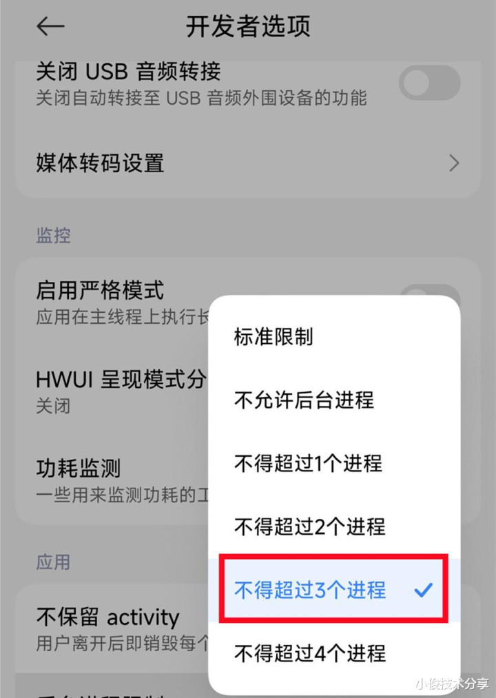 我们可以打开手机上的设置,然后在开发人员选项里面,限制后台进程, 我们把它设置为不得超过3个进程,这样手机就不会由于进程过多,而占用大量内存,从而提升手机速度!